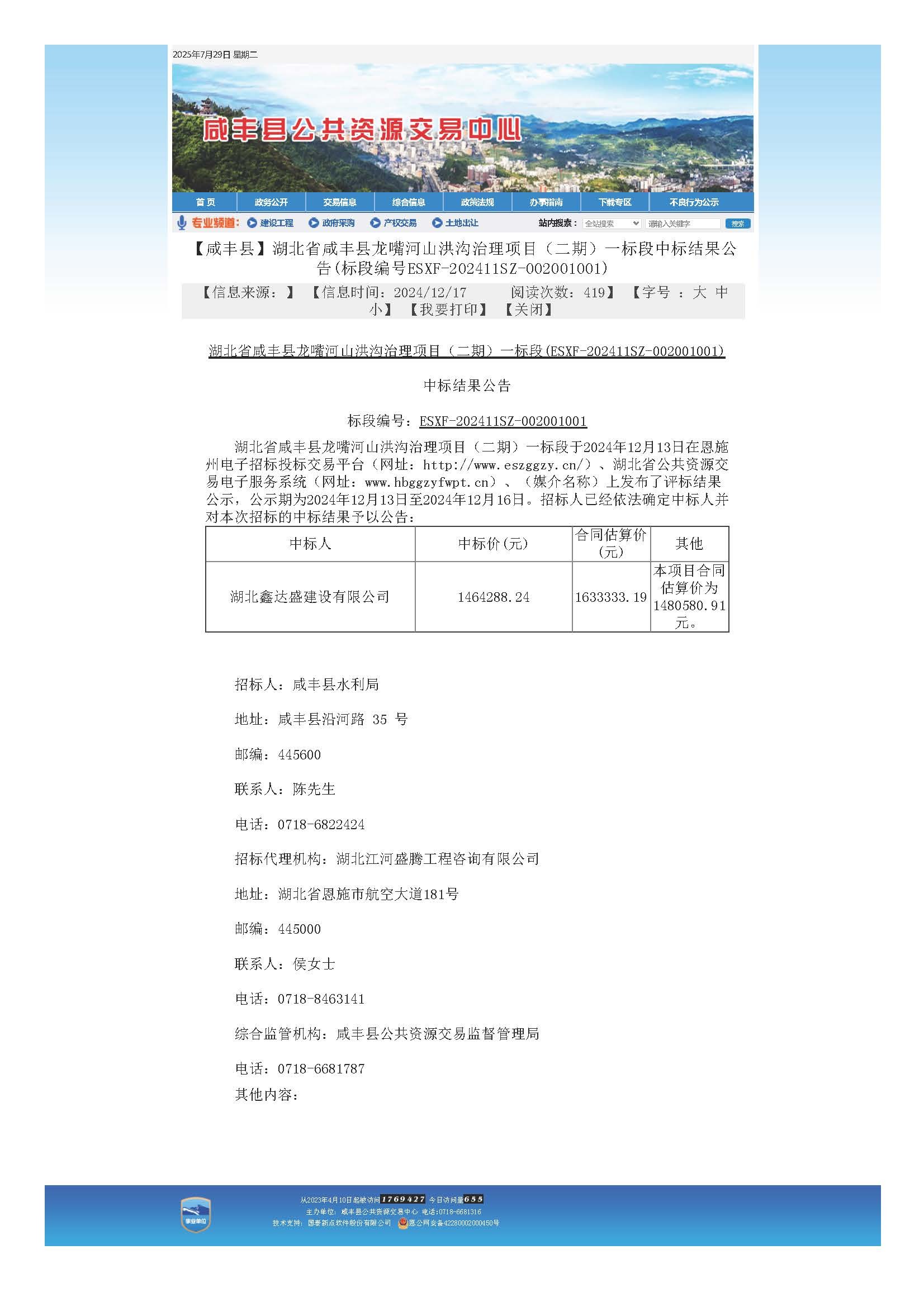 2024-12湖北省咸丰县龙嘴河山洪沟治理项目(二期)一标段