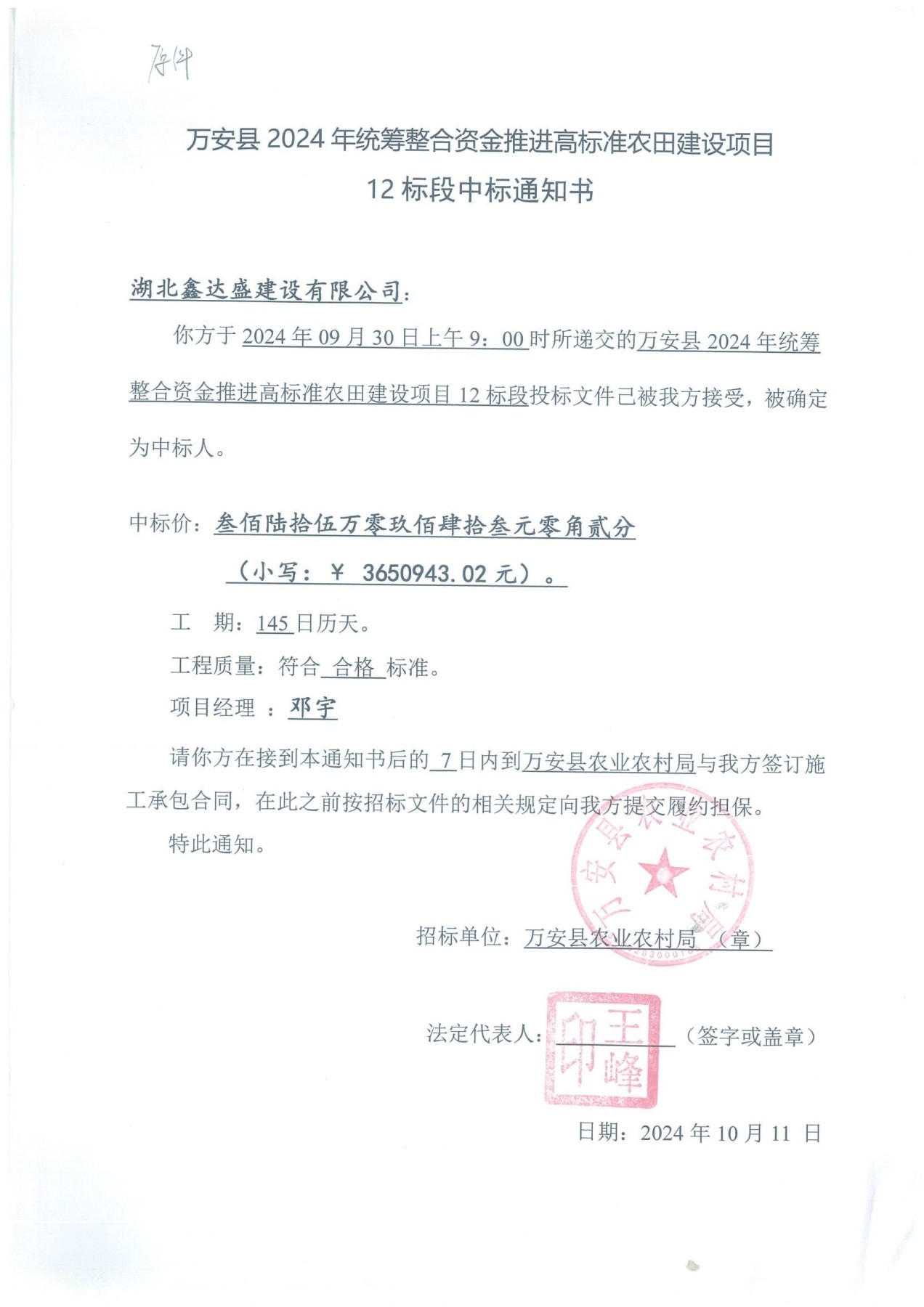 项目名称:2024-10万安县2024年统筹整合资金推进高标准农田建设项目12标段